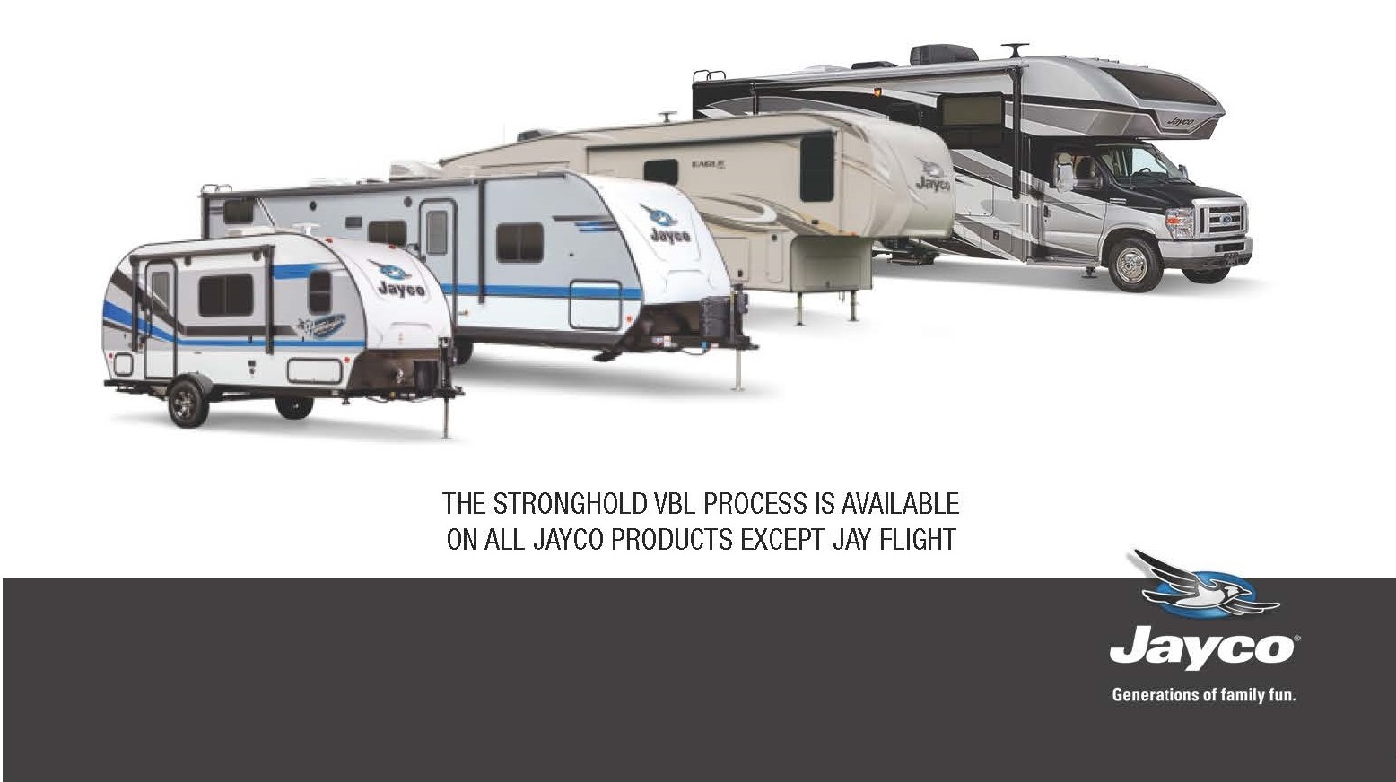 StrongholdVBL™ Vacuum-Bond Lamination is the superior construction process exclusive to Jayco’s recreation vehicles. EVERY sidewall, rear wall and slide room wall is bonded together for a minimum of 16 minutes under 144 tons of pressure to create the lightest yet strongest construction available in the RV industry; it's a part of the Jayco Difference. (Excluding Jay Flight products)