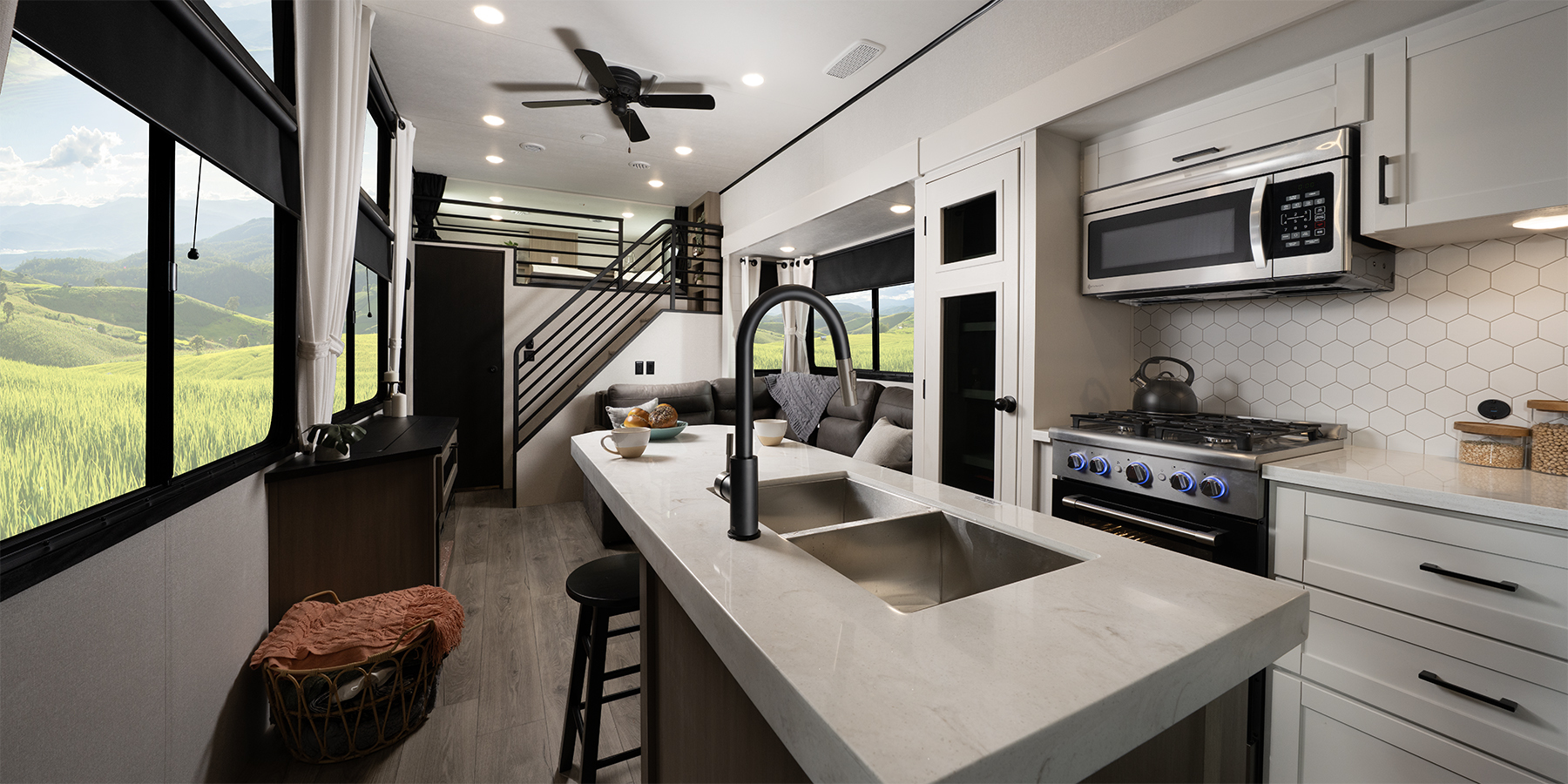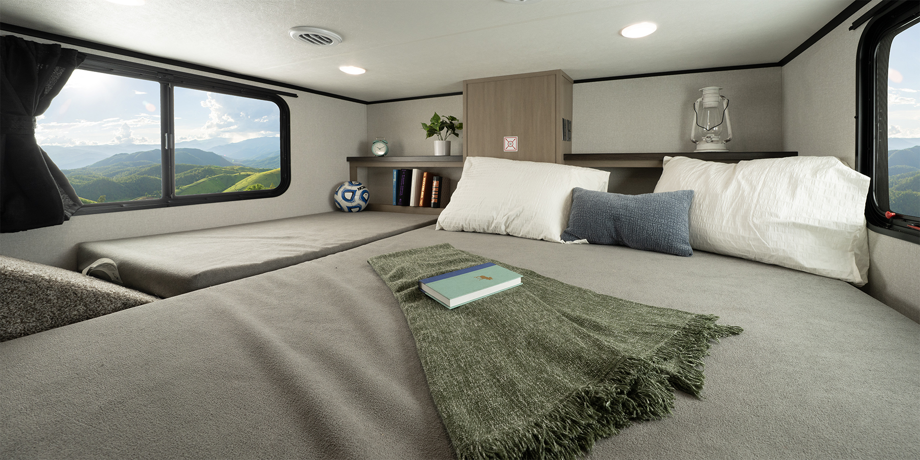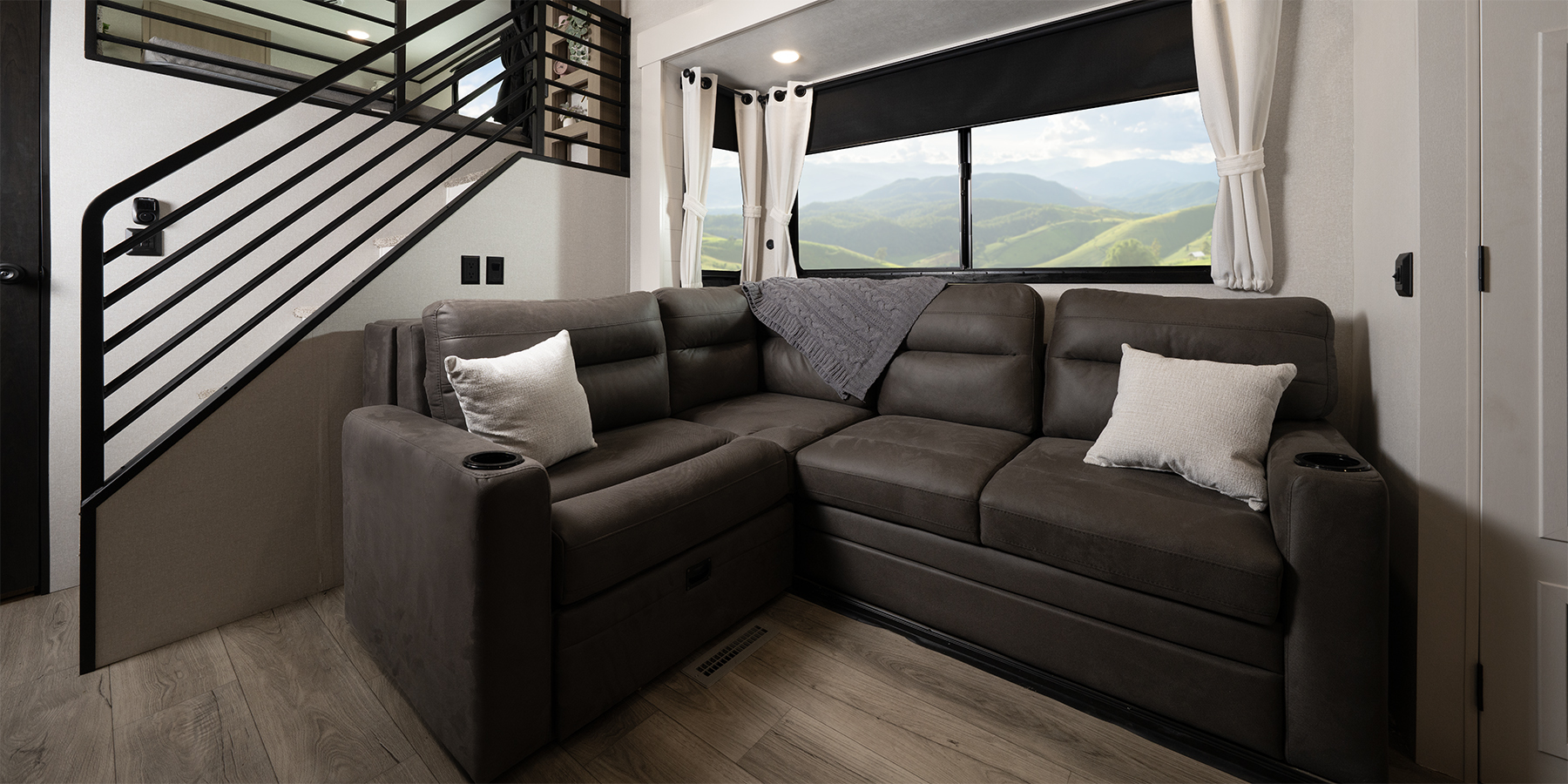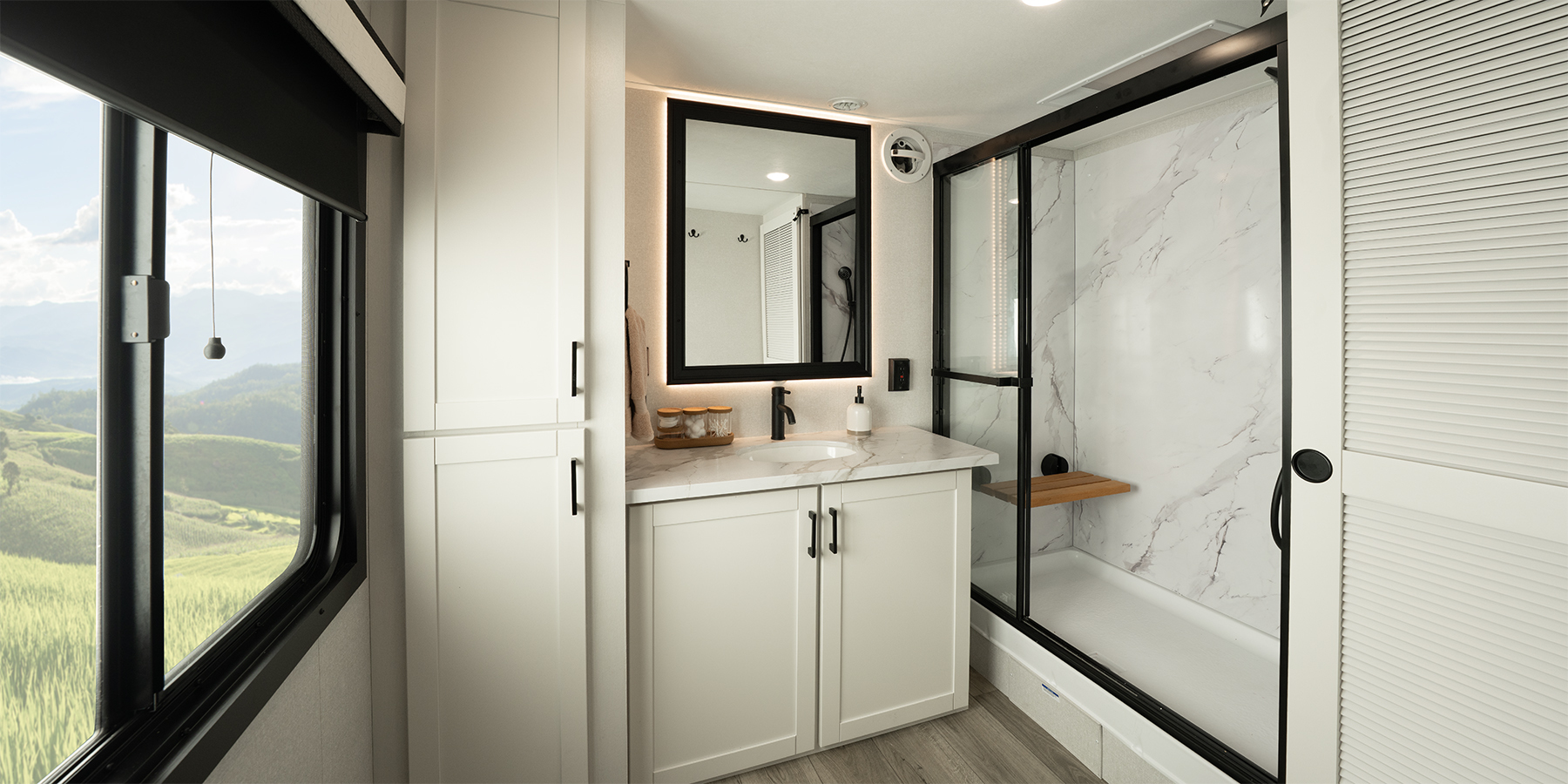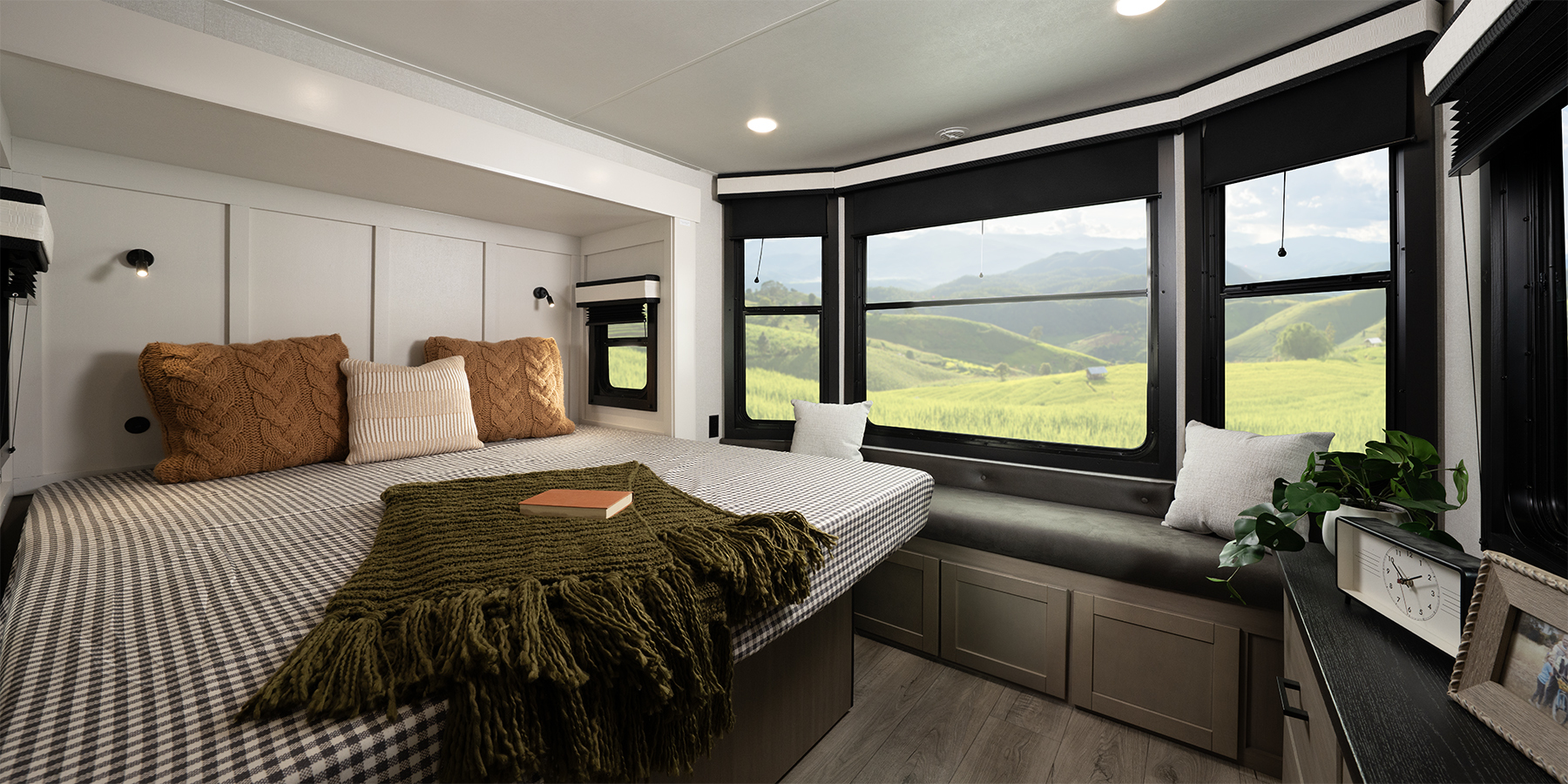 The moment you walk inside, you’ll feel the difference. The 102-inch wide body design (standard on select models) gives the Bungalow a spacious, open feel—as roomy as most luxury Fifth Wheels. Oversized sidewalls and a minimum interior height of 8 feet create an airy, residential atmosphere, while the extra-tall 82-inch slideout rooms offer even more headroom, making every inch feel expansive and inviting.