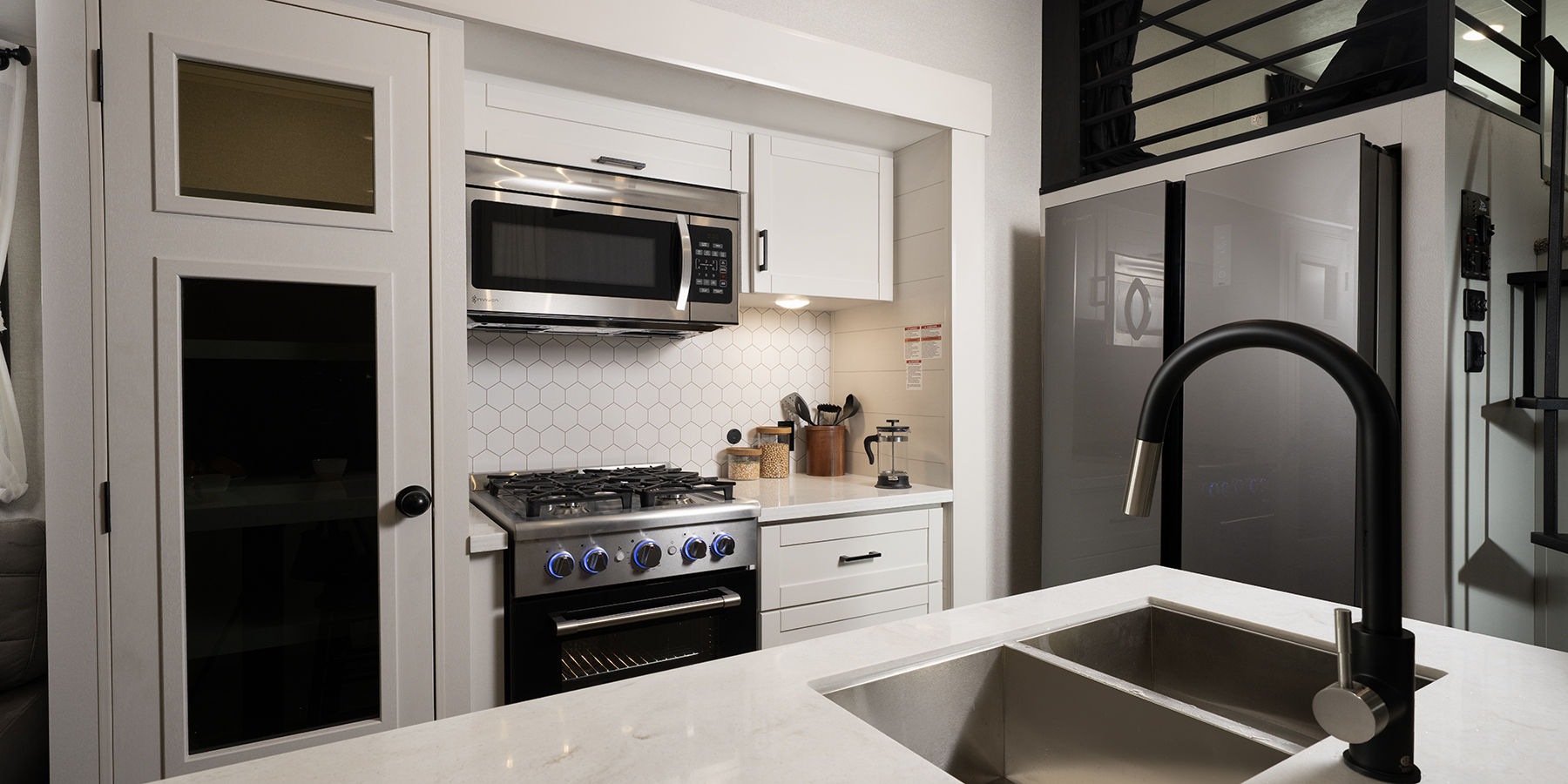 The kitchen rivals what you’d find at home. The residential-sized refrigerator keeps your groceries fresh for extended stays, while the 4-burner stove with an oversized oven and 30-inch over-the-range microwave make cooking for a crowd easy and enjoyable. Every cabinet door and drawer is crafted from real hardwood maple with hidden hinges, offering a sleek, high-end finish that blends style with durability.