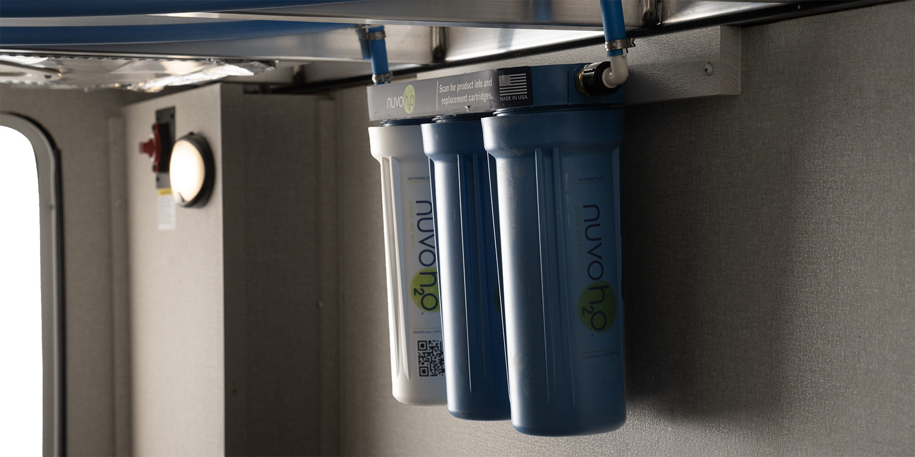 Starting with the entire-house NuvoH20 water system, it ensures clean, healthy, and great-tasting water at every faucet. The salt-free citrus filter softens water, filtering 5,000 gallons to eliminate scale buildup—making it ideal for dry camping or hooking up to city water. This system leaves your water cleaner, your skin softer, and your RV free from unsightly hard water stains.