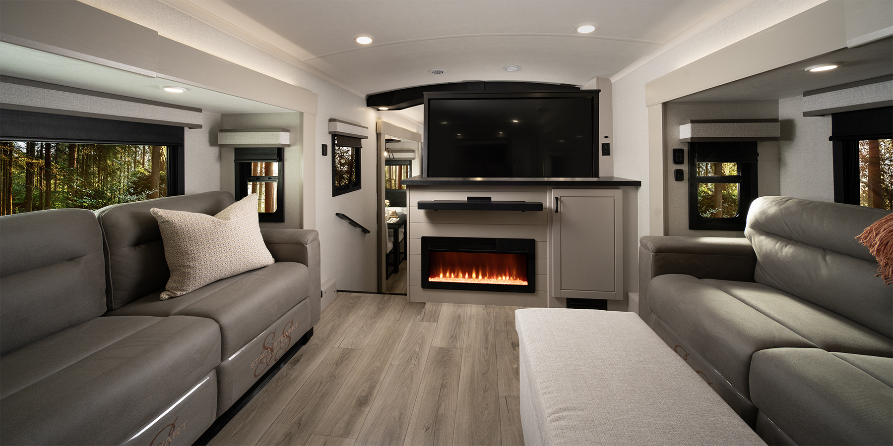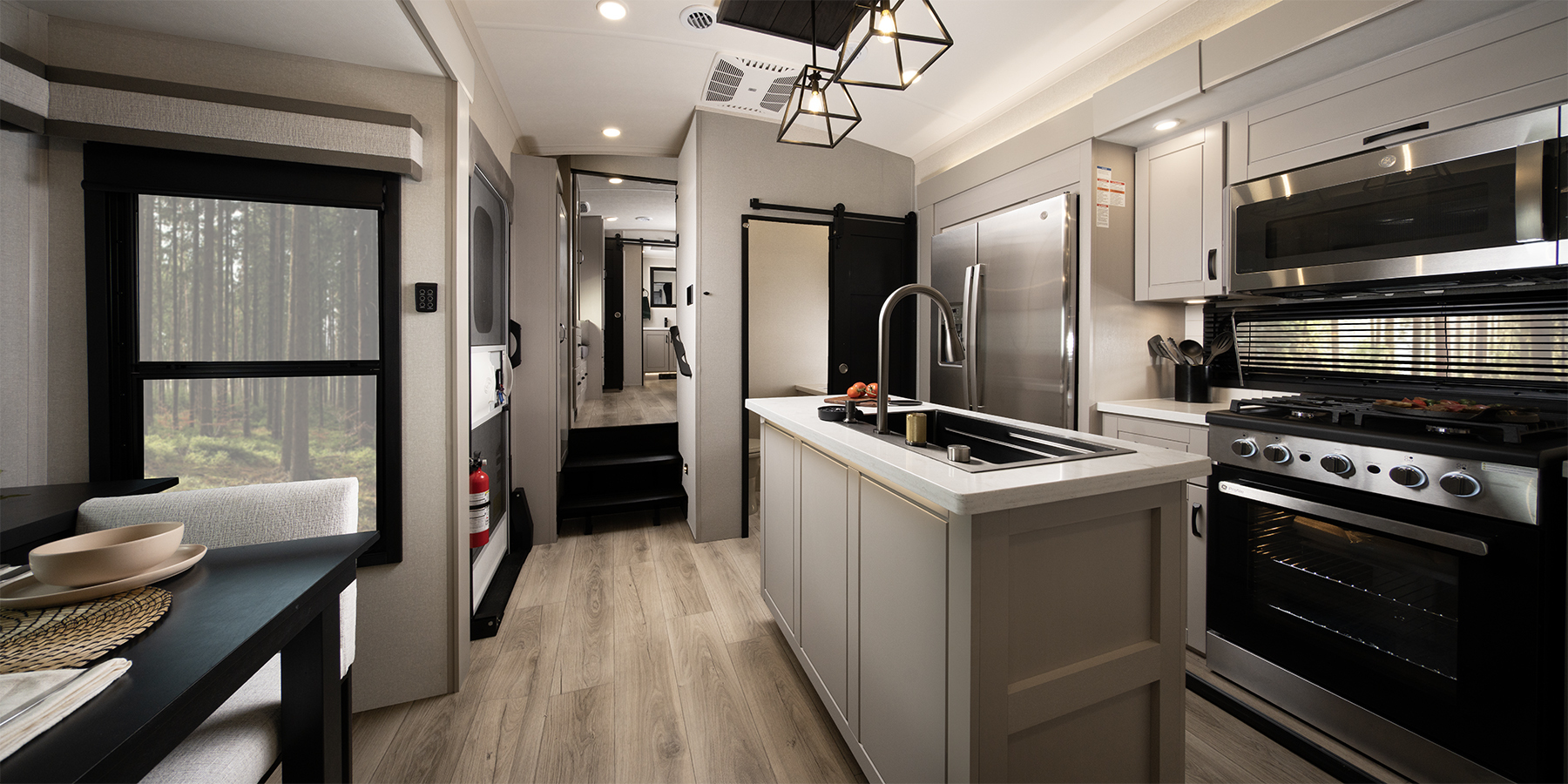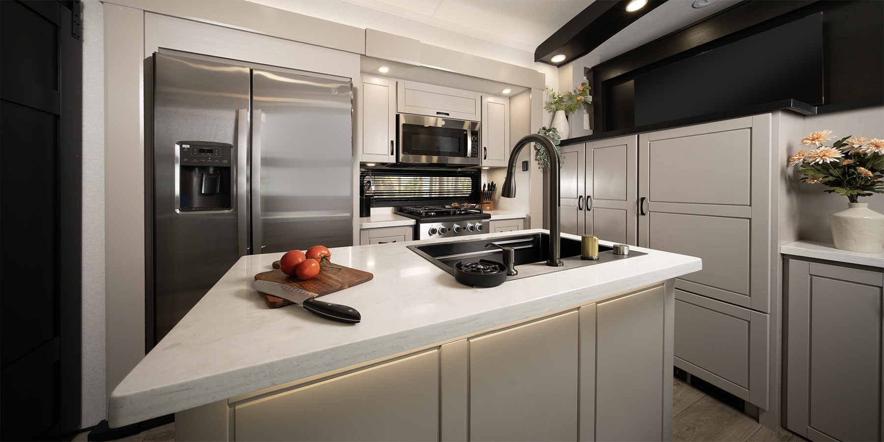 At camp, the 102-inch wide-body frame opens up to reveal a spacious interior rich with residential-grade finishes. Culinary conveniences abound with GE® Profile appliances, including a 21-cu. ft. refrigerator, 30-inch convection microwave with air fryer and a 24-inch gas range—bringing the full kitchen experience on the road. Relax in style with true residential furnishings, a JBL® sound system with subwoofer and a cozy electric fireplace, all designed for ultimate comfort and downtime.