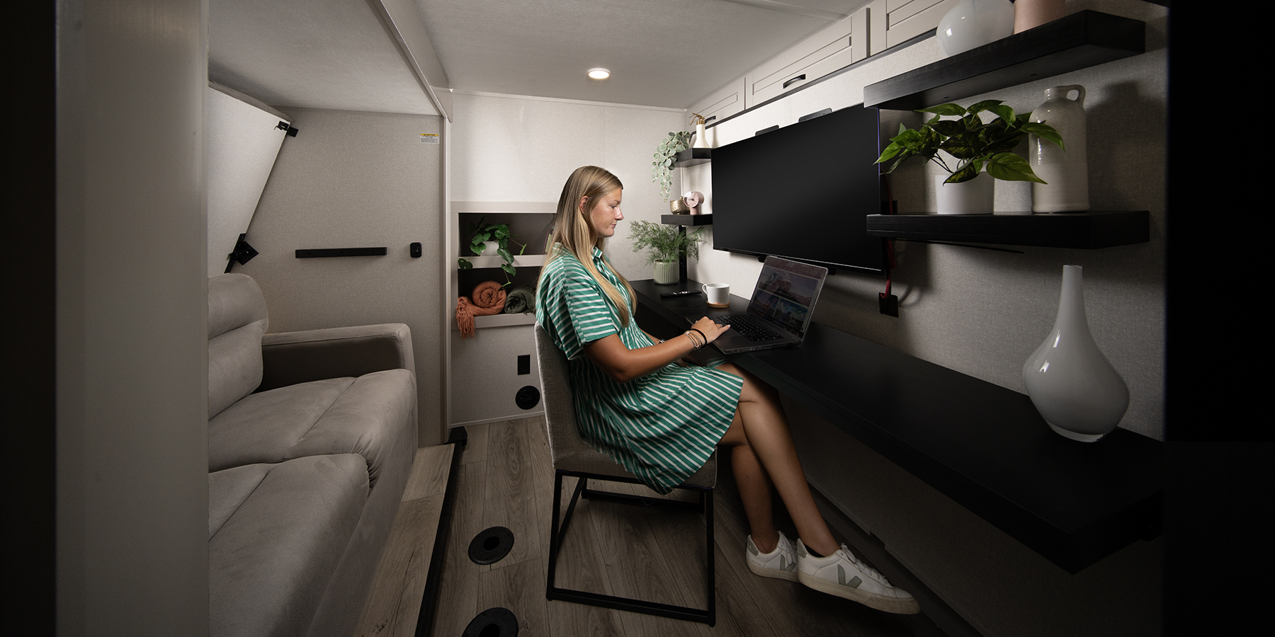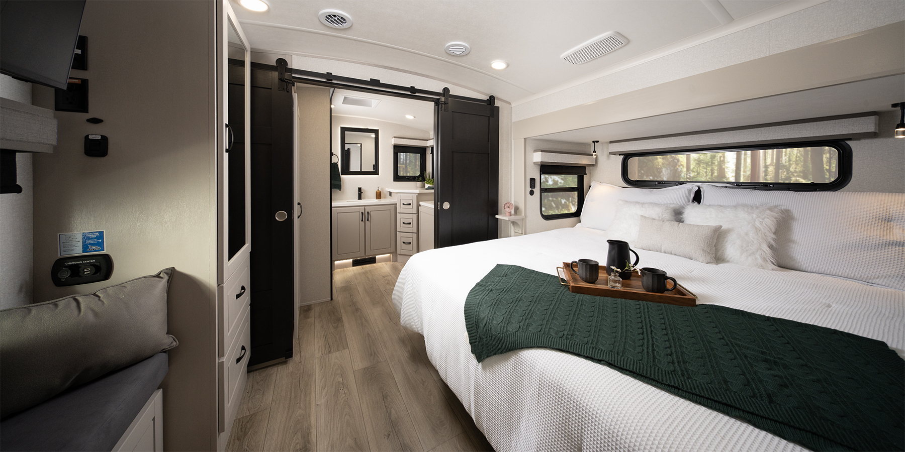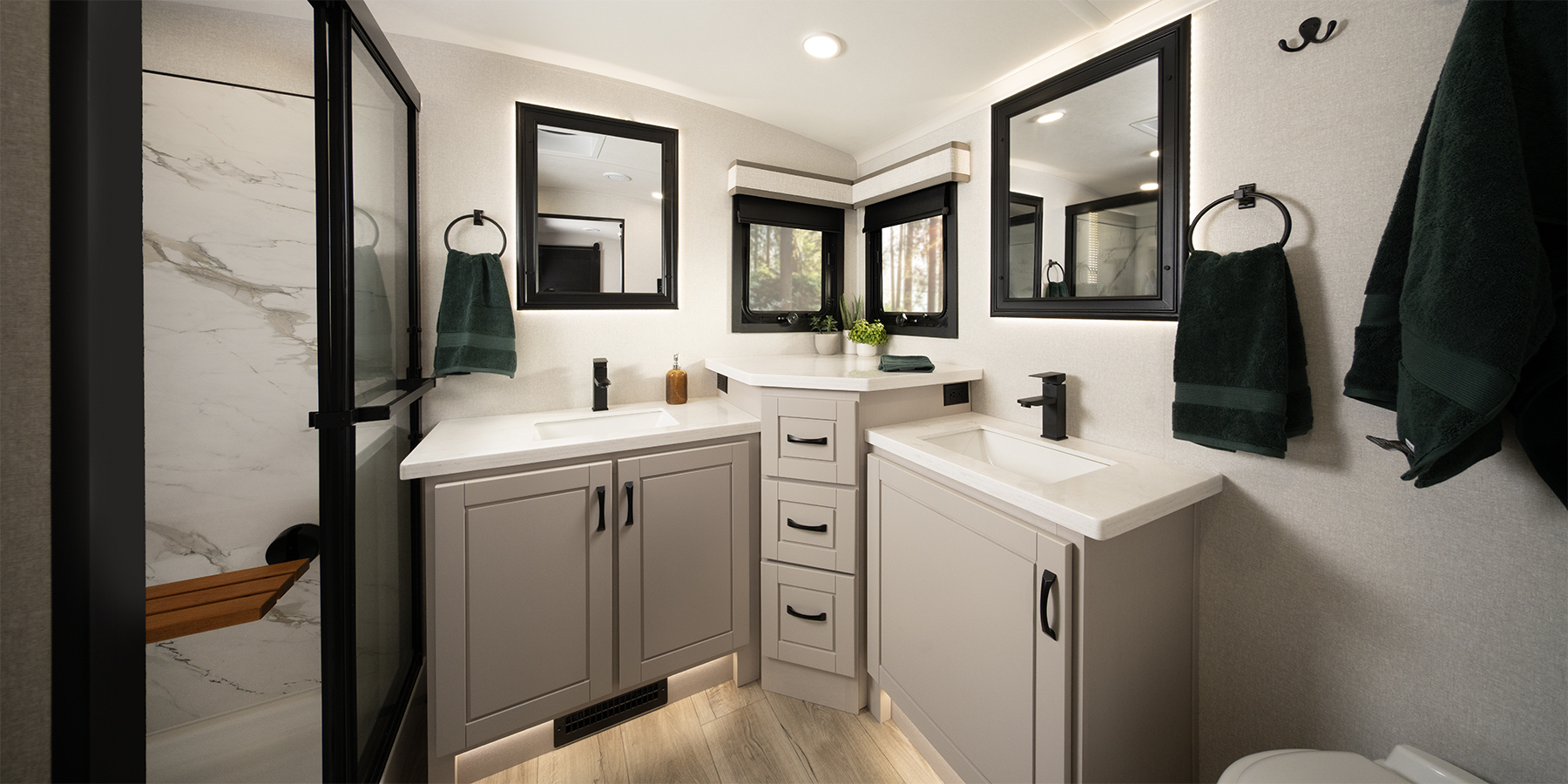 Climate control is made effortless with Jayco’s exclusive HELIX Cooling System™, while three 40-lb. propane tanks give you extended freedom for off-grid stays. In the bathroom, a residential walk-in shower with a teak seat, premium fixtures and spa-inspired details turn routine into indulgence.