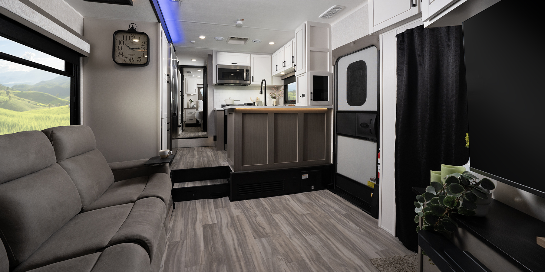 If you aim for the extraordinary, then the Jayco Seismic Luxury Series Toy Hauler is your perfect match. Starting with perhaps one of the most important parts of a toy hauler: the garage floor. The Seismic Luxury Series garage has an industry-first 2” block foam fully-insulated and laminated garage floor, making it more comfortable when you’re using the space as a room or lounging area. Not to mention it makes for easy cleaning and is easy on the eyes. While you’re sitting out on your garage-turned-sun deck, enjoy the JBL® residential sound bar with a wireless subwoofer. It’s the perfect choice for movie nights or music on the deck and easily pairs with new electronics. Too sunny out? The Seismic Luxury Series has three electric awnings—two-door side electric awnings with LED lights on the sidewall and a rear electric patio awning. Set the ambiance with the LED lights and make your coach stand out.