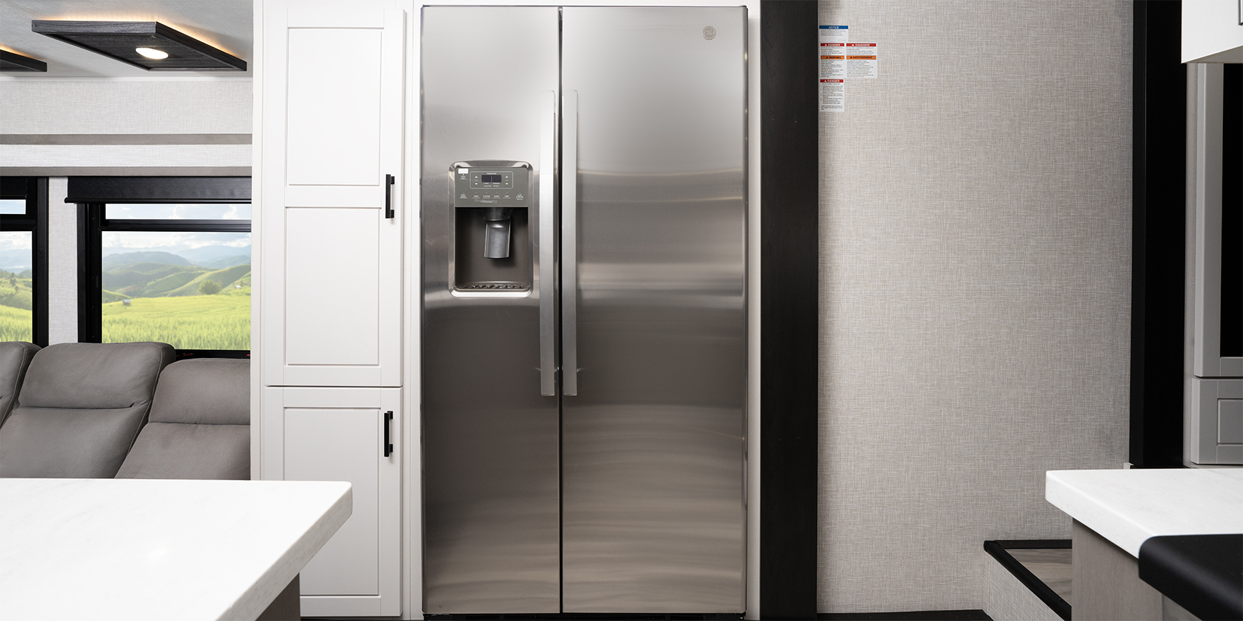 Moving into the living and kitchen area, experience the true luxury the Jayco Seismic Luxury Series Toy Hauler offers with the GE Residential Appliance Package. It includes a GE residential refrigerator with ice and water dispenser, a GE Profile Series 30 in. residential convection microwave with built-in air fryer and a GE Profile Series 24 in. range. The built-in air fryer allows you to declutter your countertop with one less small appliance. The residential built-in sink with glass cleaner and vegetable rinse allows you to create separations for multitasking while also featuring dovetail-jointed drawers.