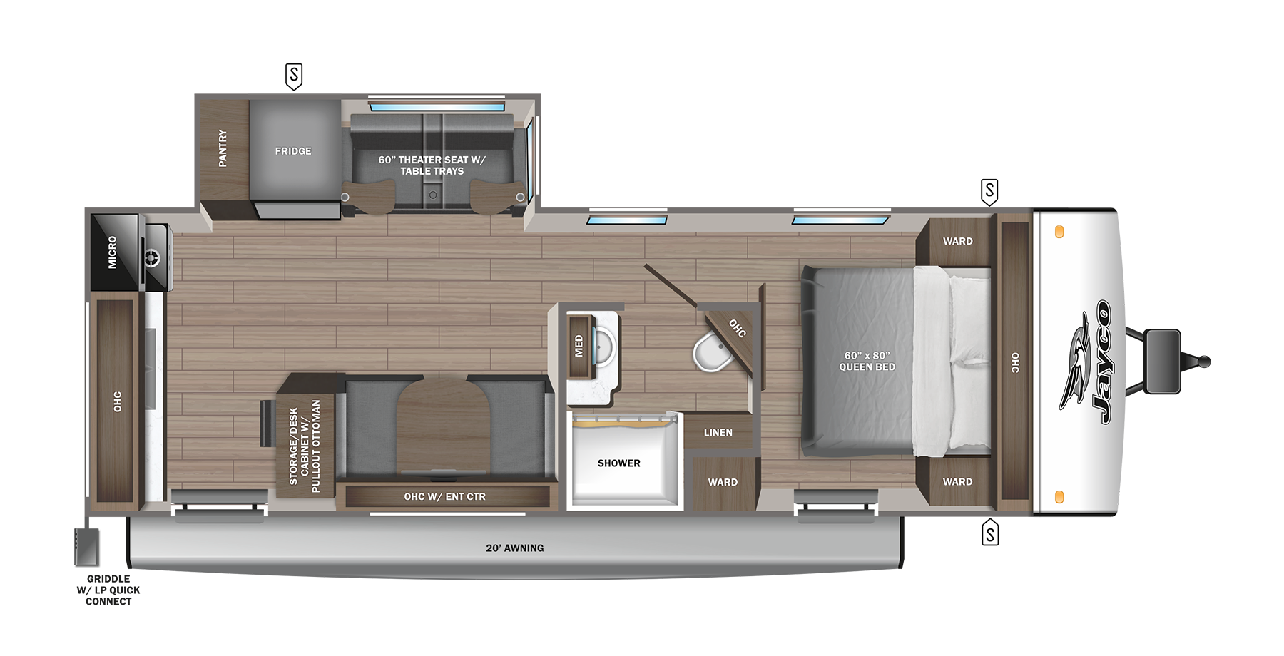 The Jayco Jay Feather is up for adventure with Climate Shield ultimate weather protection tested from 0 -100° F. The Jay Feather is constructed with stronghold VBL™ with double-sided Azdel perimeter walls and a 2-inch vacuum-bond laminated floor. Beyond superior exterior construction, the Jay Feather offers excellent interior amenities, too. Inside you’ll find a 10-cubic-foot 12V fridge, a 32 or 39-inch smart LED TV, a 60- by 80-inch queen bed and a MaxxAir power roof vent.