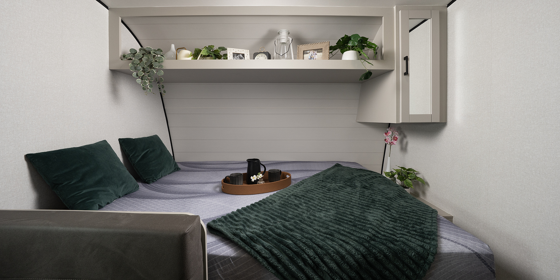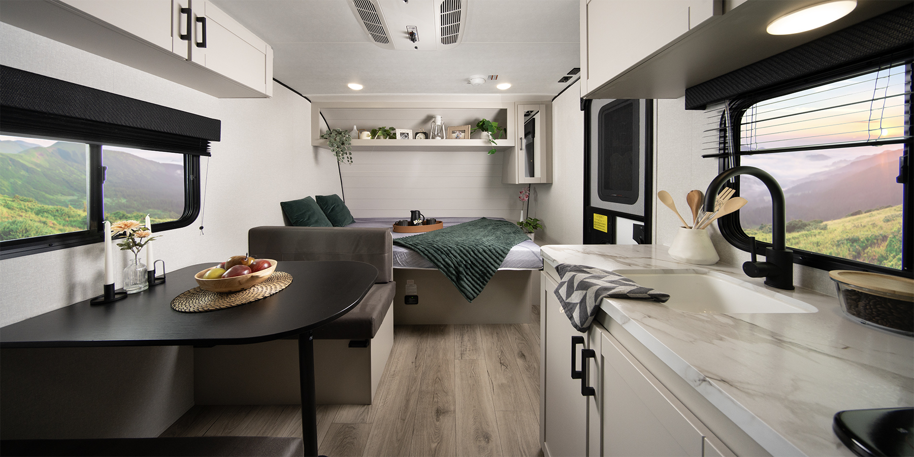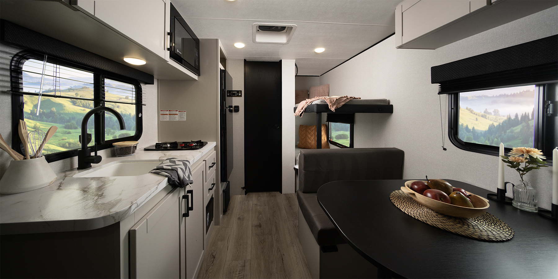 Step inside and feel at home. Durable vinyl flooring makes for easy cleanup while residential-style hidden cabinet door hinges give the space a sleek modern feel. Gather for meals at the sturdy plywood dinette, unwind on a plush queen mattress or tuck the kids into ultra-reliable bunk beds rated for 300-600 lbs.—so you can rest easy knowing they’re built to last.