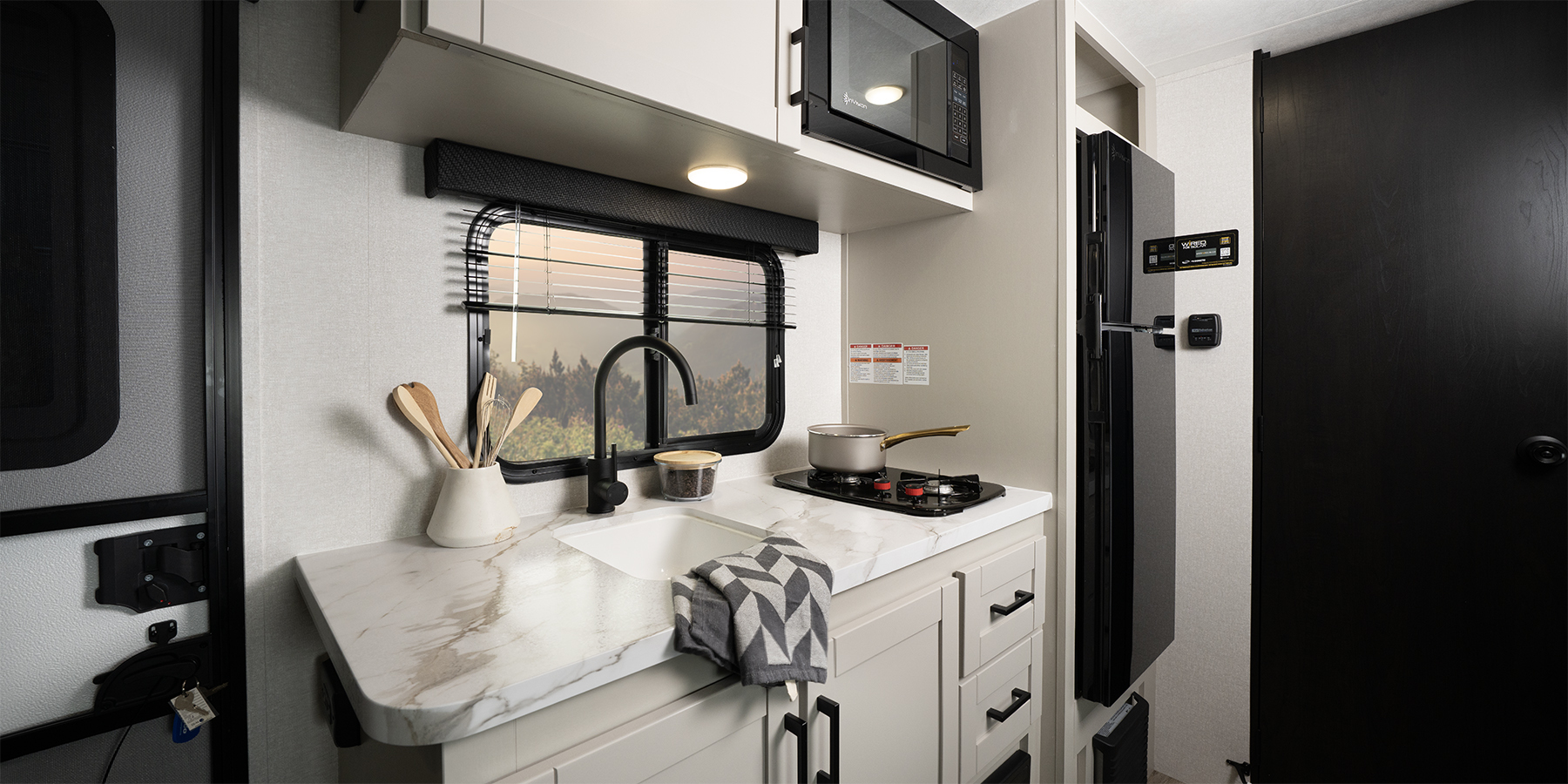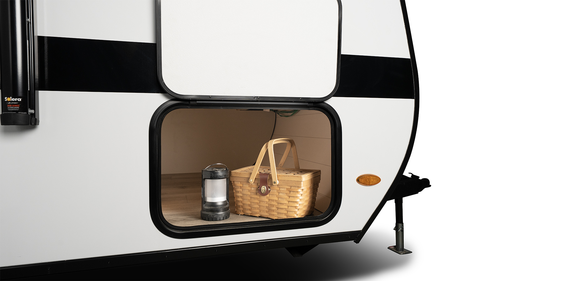 The Customer Value Package takes convenience to the next level. Keep food fresh in the 5-cu. ft. 12V refrigerator, stay cool with the 13,500 BTU roof A/C and prep meals with ease using the microwave oven. Want to camp off-grid? The roof-mounted solar prep makes boondocking a breeze. And no matter the weather, the 19K BTU furnace keeps you cozy on chilly nights while the power awning provides shade on sunny afternoons.