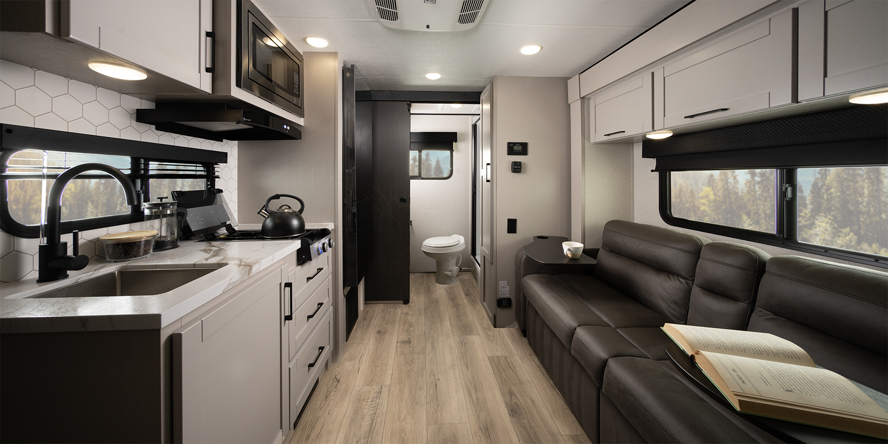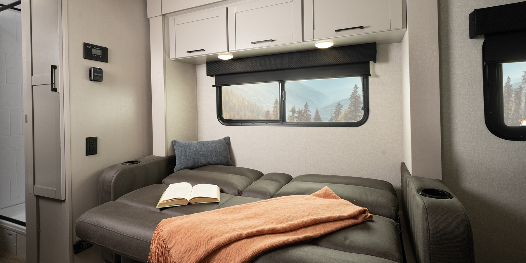 The cabinet doors and drawers are oversized, increasing storage space and maximizing the overall use of space. Hidden hinges and a seamless countertop in the kitchen add to the luxurious, residential feel. The InVision Suite appliance package comes standard and includes an 11 cu. ft. 12V fridge, which is five cubic feet larger than other brands. The kitchen in this lightweight Travel Trailer also features a stainless-steel sink. In the bathroom, you’ll find high-rise gooseneck faucets and a new roller-style shower enclosure, that opens up the space even more.